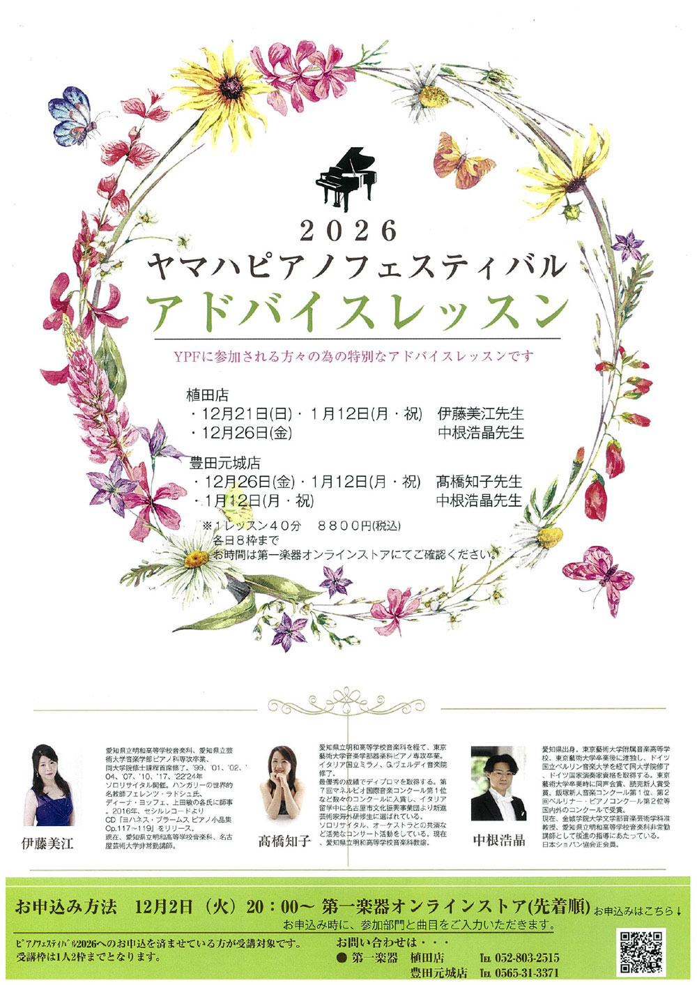 第一楽器各店では、「第11回 ヤマハジュニアピアノコンクール(YJPC)出場者選考会 ピアノフェスティバル2026 第一楽器店別大会」を実施し、選考会で選出された方を「第11回 ヤマハジュニアピアノコンクール 二次選考」に推薦させて頂きます。