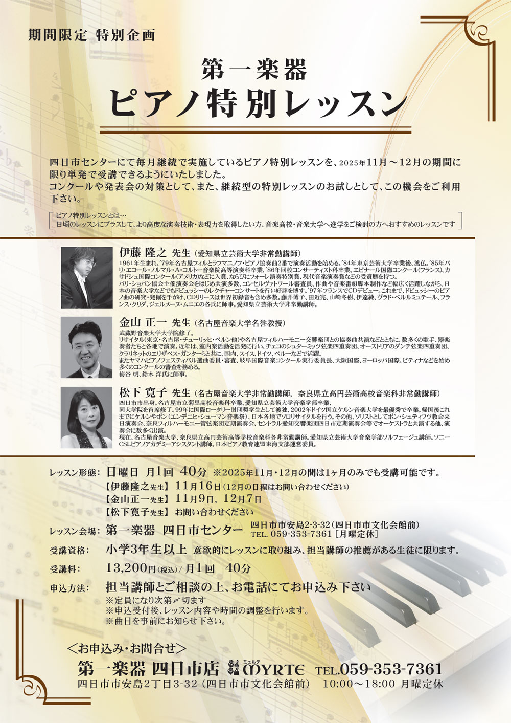 | 日頃のレッスンにプラスして、より高度な演奏技術・表現力を取得したい方、音楽高校・大学へ進学をご検討の方、コンクールやイベントに向けてレベルアップしたい方へオススメのレッスンです。 ※時間・日程は四日市店へお問合せください 【特別レッスン】 11~12月は単発受講が可能です。詳細はこちらのチラシをご確認ください。 |