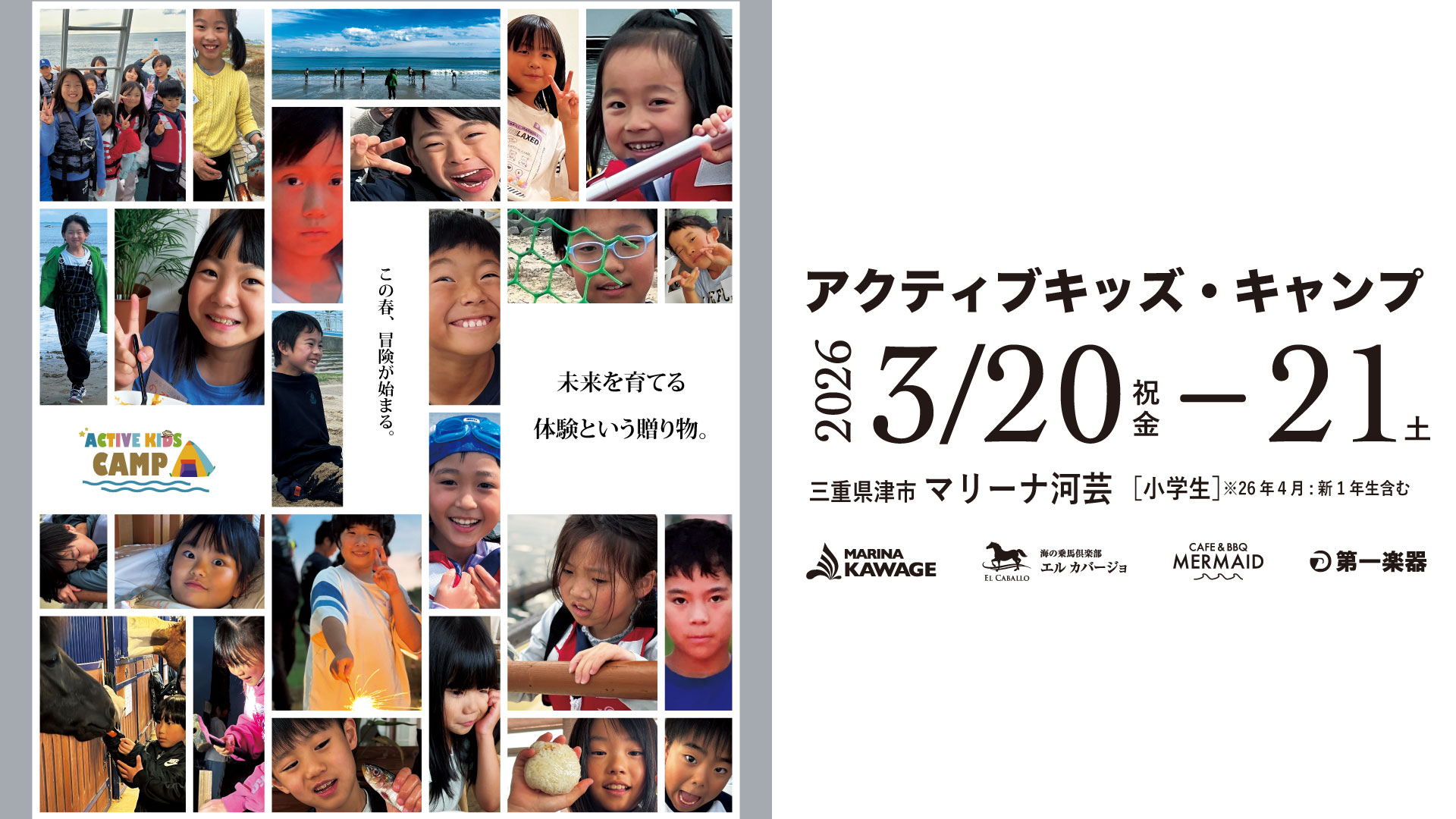 マリーナ河芸(津市)で開催される小学生限定の1泊2日・春の自然体験キャンプ。