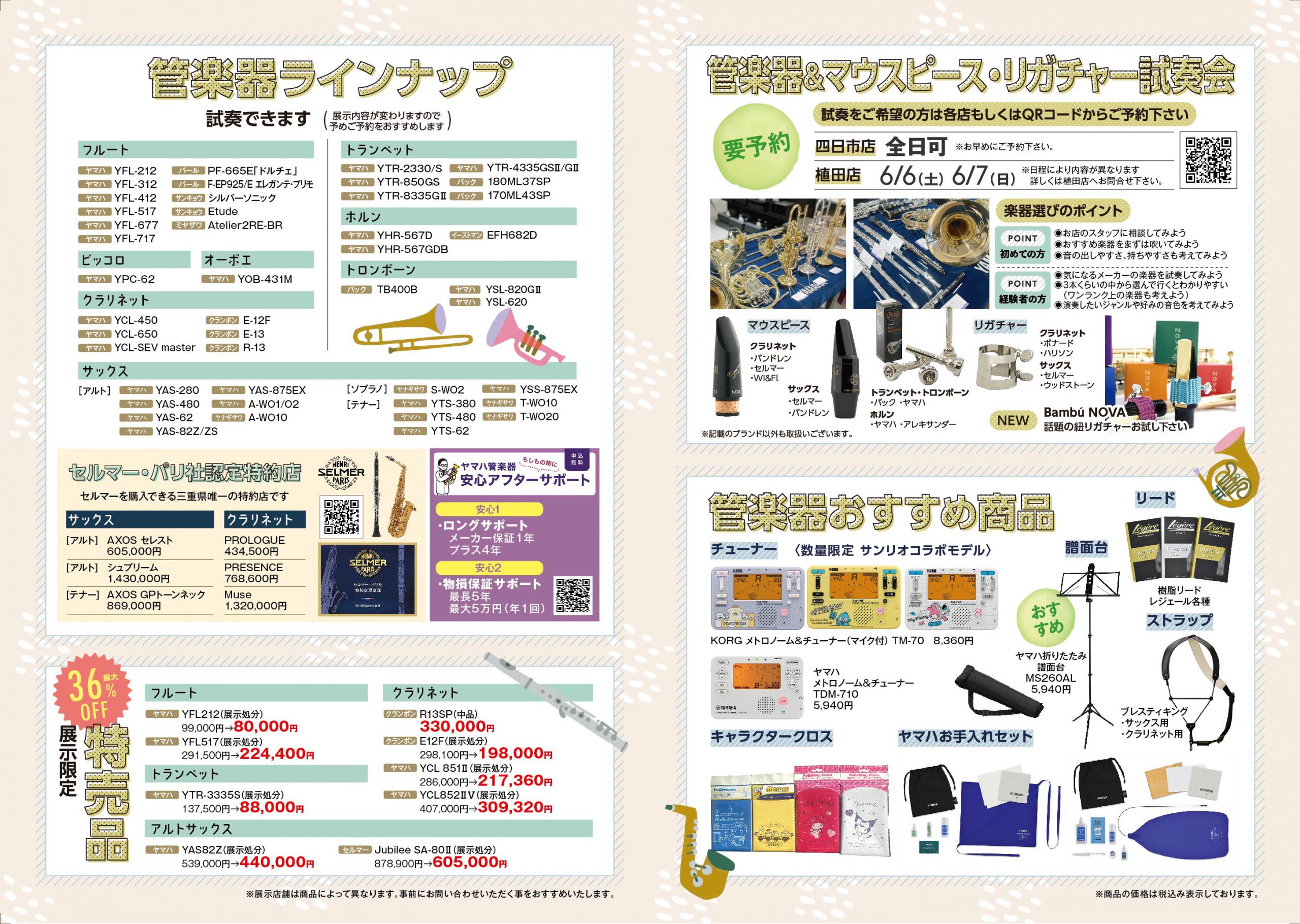 フェア期間中は、管楽器本体のご相談はもちろん、無料点検会、コンサート、体験会、掘り出し物市、関連商品の特価販売などを実施いたします。