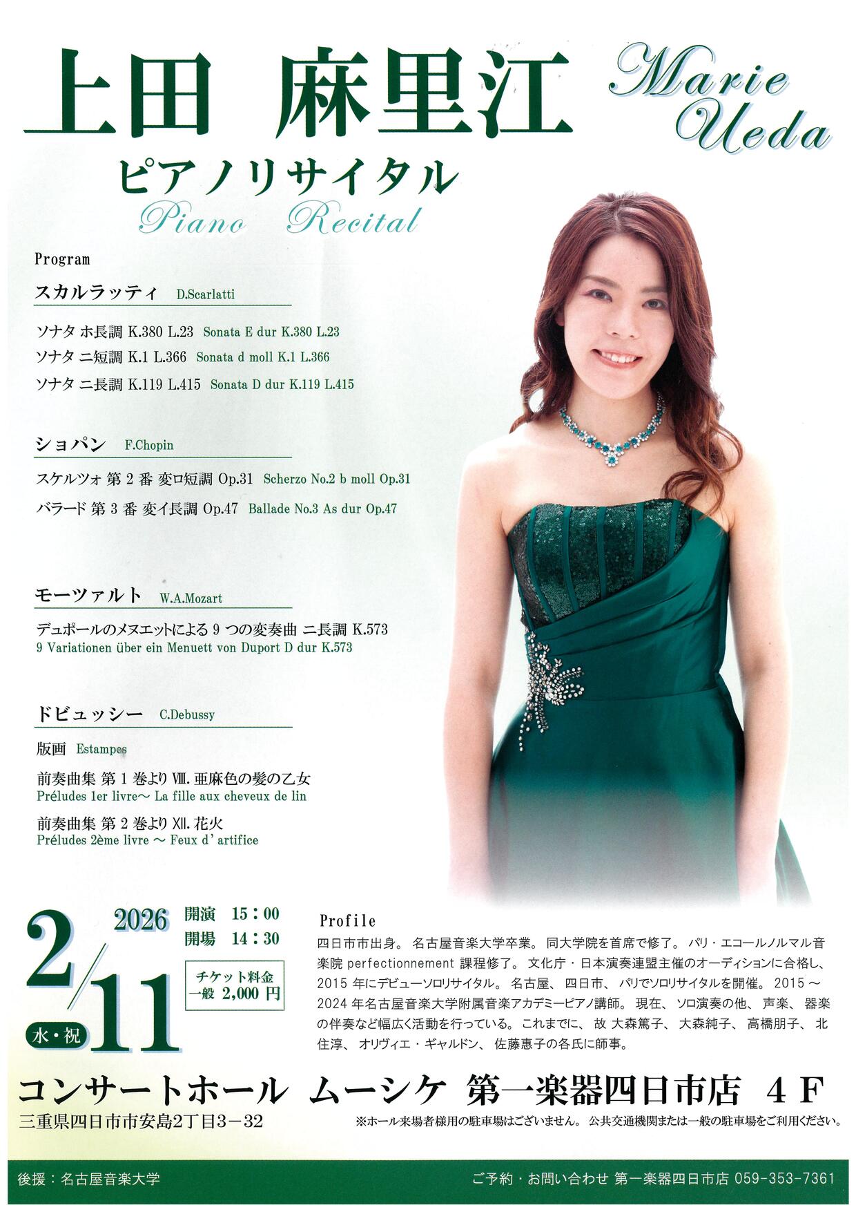 【ムーシケイベント情報】2026/2/11(水)上田麻里江ピアノリサイタル